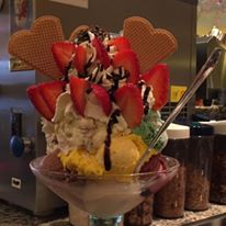 Vanilleeis, Erdbeersoße, weiße Schokoladenraspeln & Sahne