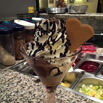 Milchspeiseeis, Eierlikör, Schokosoße, Krokant & Sahne